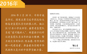 【7】2016年5月30日,习近平总书记又给大陈岛老垦荒队员的后代、椒江区12名小学生回信,希望孩子们牢记老垦荒队员当年的奋斗精神,努力成长为有知识、有品德、有作为的新一代建设者,准备着为实现中华民族伟大复兴的中国梦贡献力量。