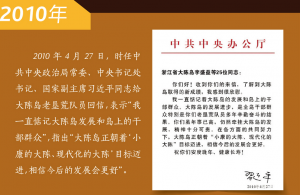 【6】2010年,时任政治局常委、国家副主席给大陈岛的老垦荒队员回信,表示“我一直惦记大陈岛发展和岛上的干部群众”,指出“大陈岛正朝着‘小康的大陈、现代化的大陈’目标迈进,相信今后的发展会更好。”